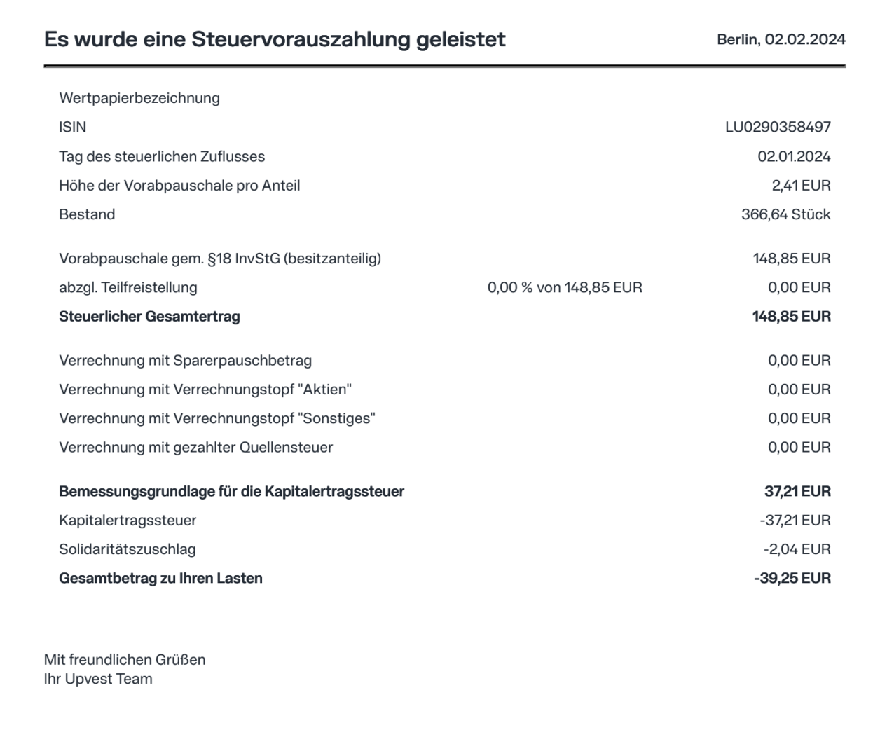 type | TAX_PREPAYMENT_DE : German tax prepayment (Vorabpauschale). The reports are created in the clients' branding and contain a detailed breakdown of the various tax amounts. |