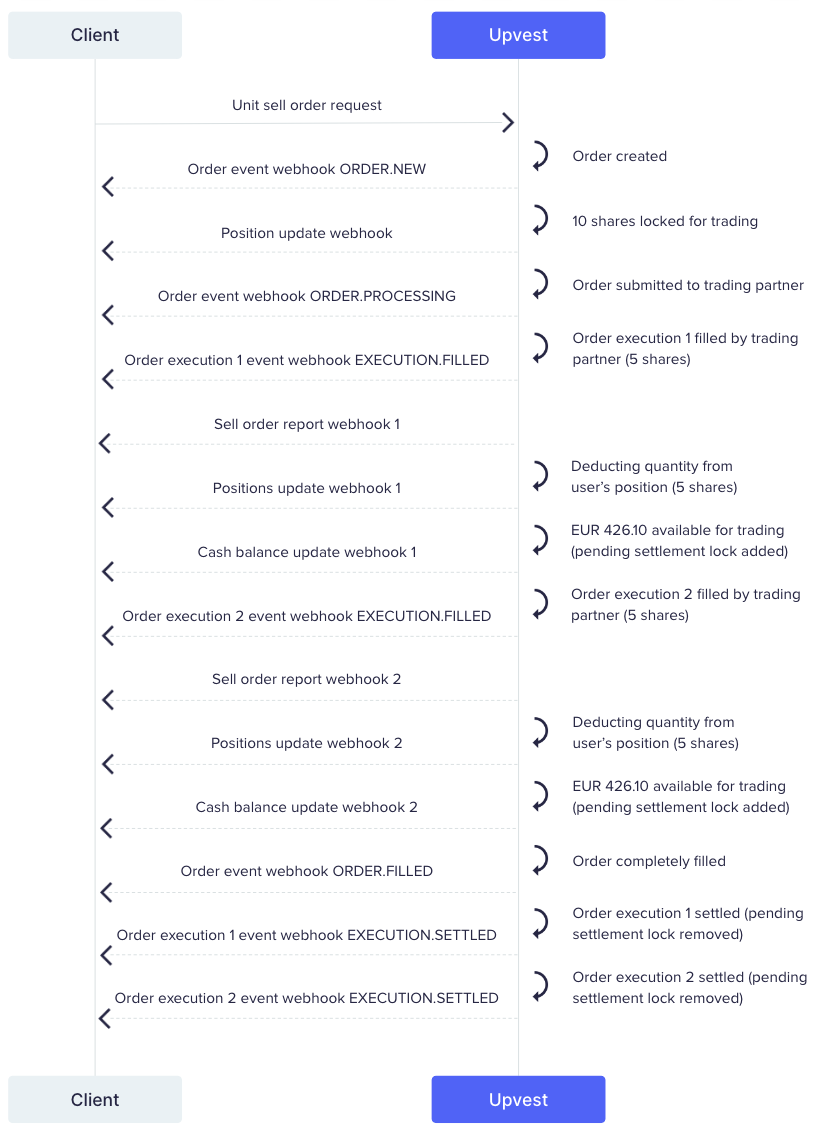 The following flow diagram illustrates the unit sell order flow with two equal order executions (at an execution price of EUR 85.22), including all related state changes, cash balance and positions updates, as well as sell order report webhooks.