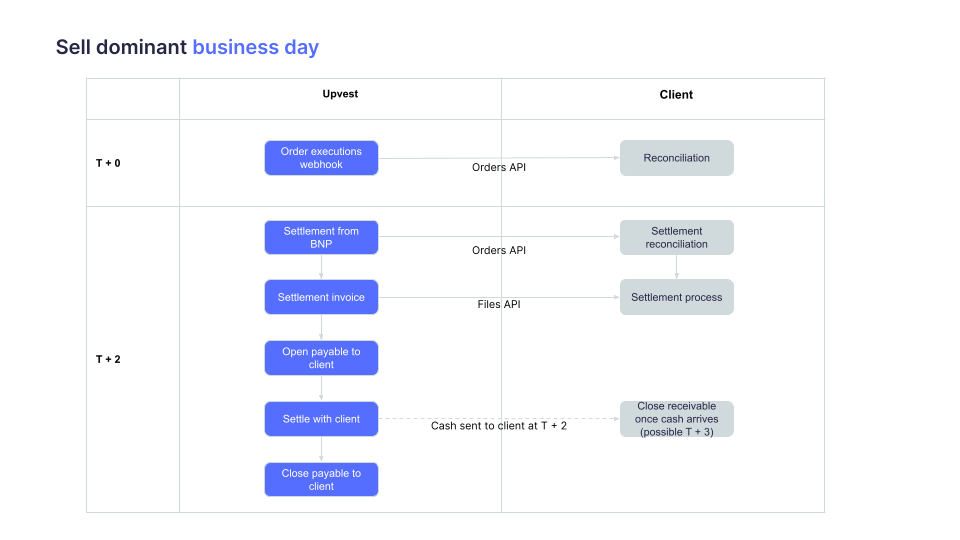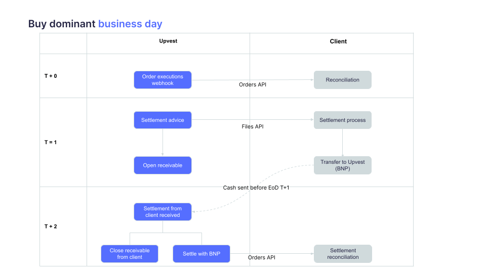 In an Omnibus setup, Upvest supports settlement on a post-trade basis, while clients manage cash locks independently of Upvest's order execution.