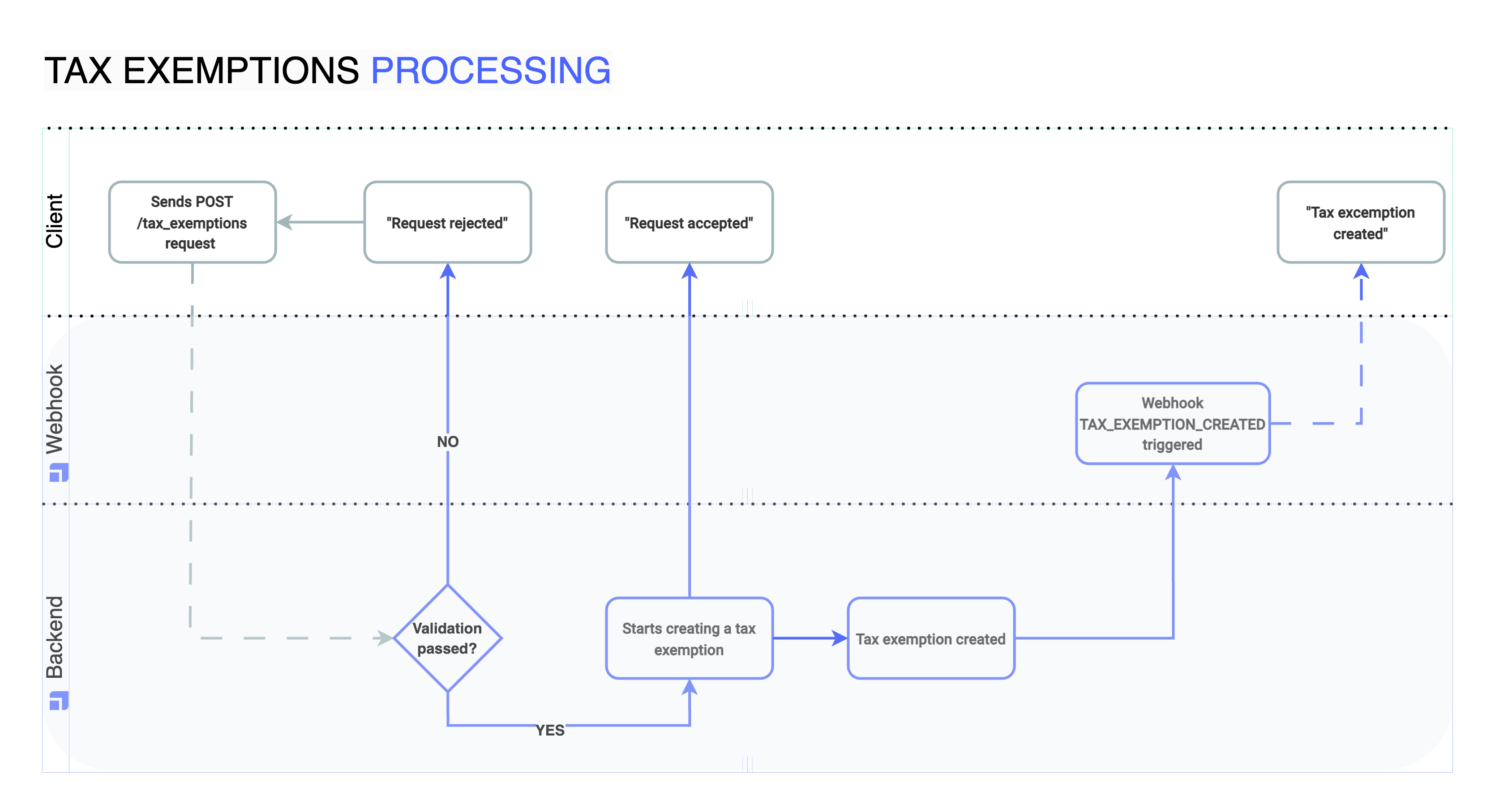 In general, all tax exemption requests will return a response that indicates whether the request has been accepted for processing. The final result of the processing is returned asynchronously. Each HTTP response contains the ID of the tax exemption.